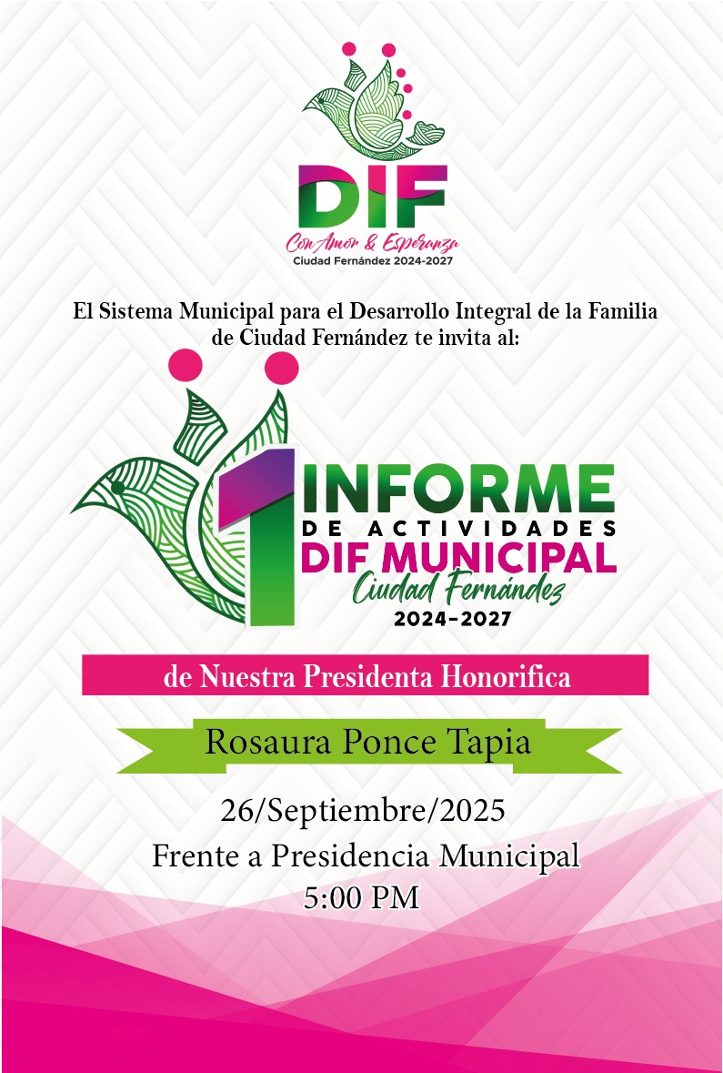 El Sistema Municipal DIF de Ciudad Fernández, que preside la Sra. Rosaura Ponce Tapia, tiene el honor de invitar a toda la ciudadanía al Primer Informe de Actividades, donde se presentarán los programas, apoyos y acciones realizadas durante este primer año de trabajo a favor de las familias fernandenses.