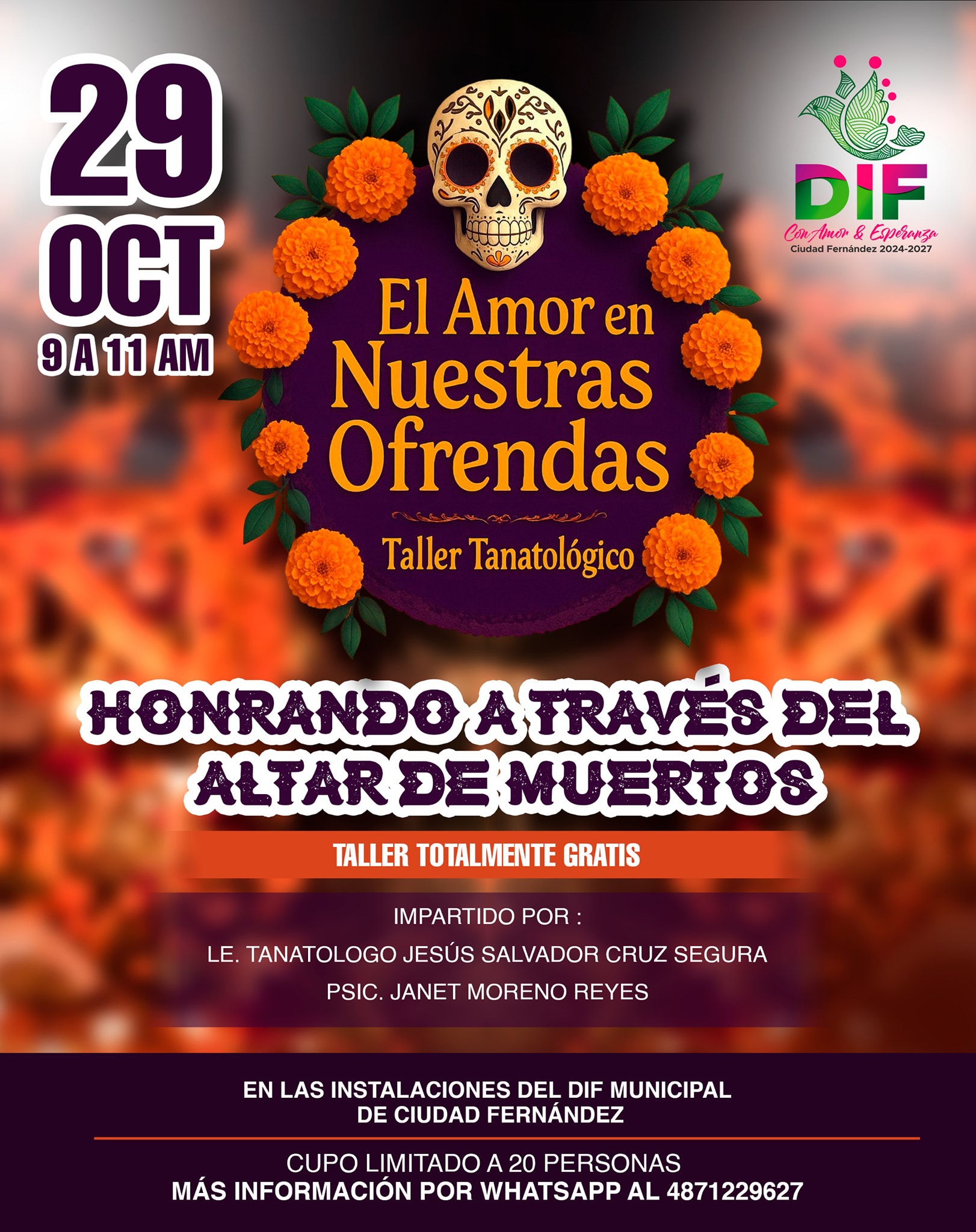 El Sistema Municipal DIF, dirigido por la Señora Rosaura Ponce Tapia, te invita a participar en el Taller Tanatológico “El Amor en Nuestras Ofrendas”, una actividad especial para honrar a nuestros seres queridos a través del altar de muertos.